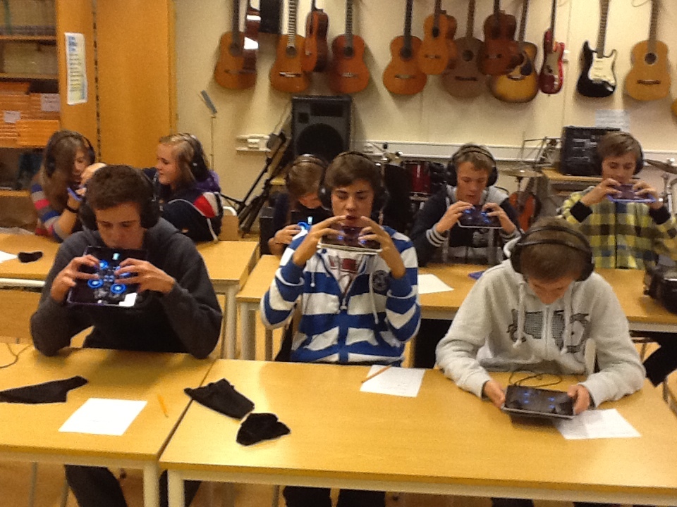 No har kulturskulen offisielt starta sitt etterlengta iPad prosjekt i grunnskulen. Idag skulle elevane i 10 klassse spele fløyte på iPad, tru det eller ei. Men ved hjelp av mikrofonen på iPad kan ein blåse inn i den slik at lufta generere fløytelyd i ein App som heiter «Ocarina2». Morsomt ! Og det ser jo ystyrtelig morsomt ut.