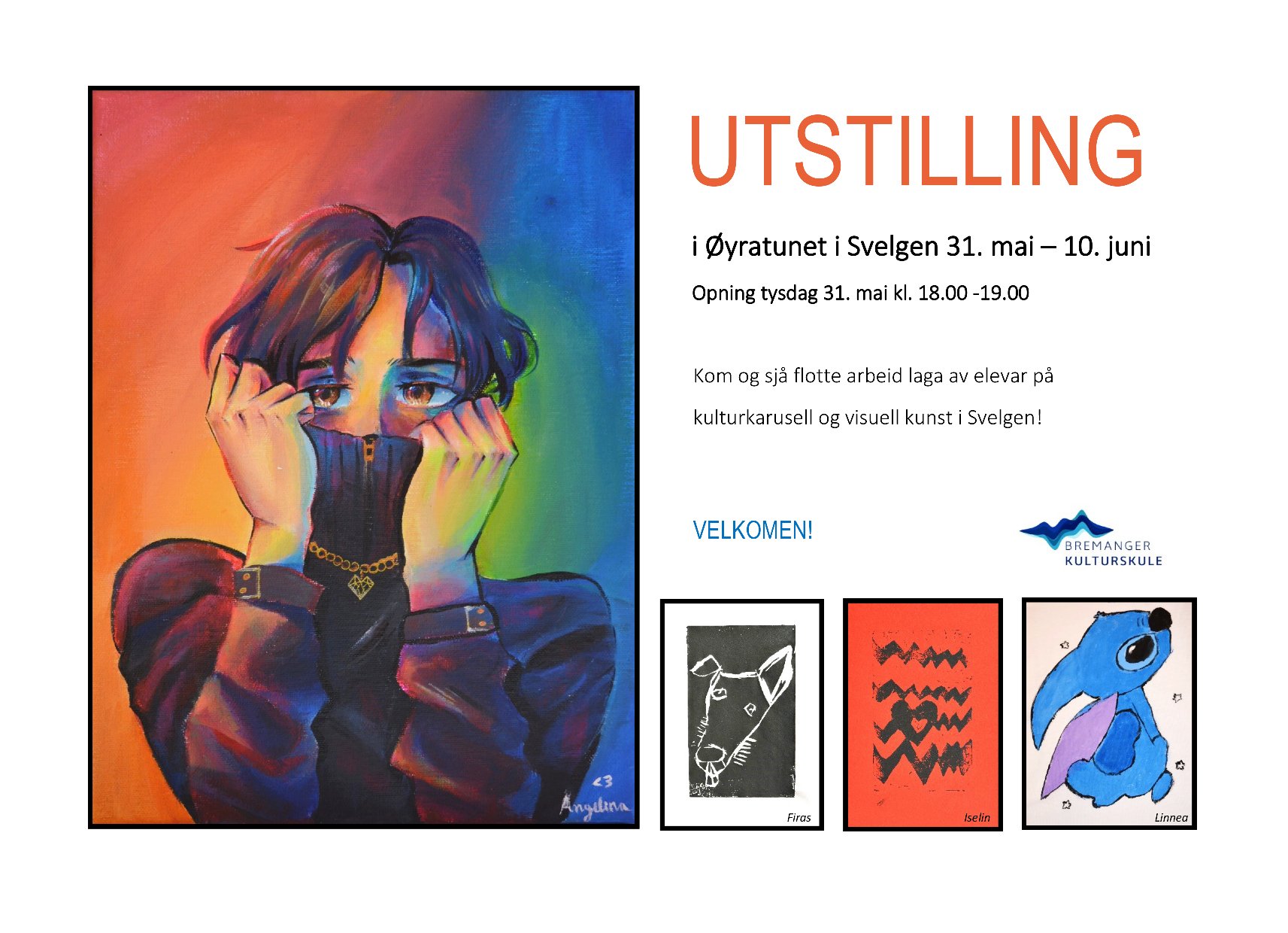 Først ut er Svelgen med sine kunst og musikkelevar. Kunstutstilling på Øyratunet Svelgen, tysdag 31. mai kl. 18.00! Elevane på kulturkarusell og visuell kunst (Bremanger kulturskule i Svelgen) viser eit utval arbeid dei har laga siste halve året. (1. – 10. klasse)